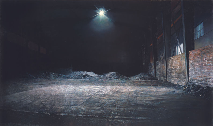 Ruins in the night; a pile of broken-up bricks; a burning garbage heap; an abandoned movie theater; a coal storage with no stores left; a quarantined sickroom; a gloomy tunnel; a line of willow trees by the side of the road at night; a rain-flooded underground passage from which rain water had just been drained; a blank steel billboard under the twilight – Lu Liang’s paintings feature the gradual erasure of people as well as the narrative in their imagery. What remains on canvas are the scenes themselves, benighted and dismal, such as a concrete floor illuminated by electric lights; a patch of dirt and tire tracks in the mud, and they forcefully take hold of us. Lu Liang said, “Abruptly extricate objects from everyday life, severe them from their environs and give them a beam of light – at that instant they acquire meaning.” Lu Liang’s paintings shed light to the microscopic fissures of our perception, which conceals the experience of everyday life, suddenly exposing them to the light of day.