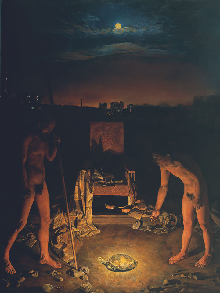 由阅读《庄子》引发的以现代人物场景来编织古代寓言的想法,并以古典写实手法作为表达的方式,引导我在2004年开始先后创作了庄子寓言系列,逐步确立了光线、叙述逻辑等个人基本的面貌,在技术与画面的控制上也不断积累着经验。《屠龟》是这批画中最后一幅,但记得当时颇不满意,因为从细致的程度上没有超过上一张。布、砖、沙发等在有前几张作品技术探索的基础上表达起来毫不困难。得来全不费功夫。但现在看来,此画确是那一批作品中创作思路最贯穿的一幅。沙发象征着王权,王者不见了,沙发上打开的书代表知识,有知识,才能成为统治者,反过来统治者也统治着知识的所有权与解释权。沙发是70年代的样子,那种红塑料皮的面料是我非常熟悉的。(小时候我家就有一个类似的沙发。)金色的布挂在沙发扶手上暗示着王的袍子,与翻开的书页都暗示着王的暂时离开。持丈者代表巫师、为王献策的人。献龟者渔夫余且,则是一脸媚相,是政令的实行者、无条件的拥护者。地上的瓦砾有工地上拣来的红砖与卵石,也有参杂其间一些秦砖汉瓦的残片,分别象征现代社会的激流勇进,与往昔文化的颓败。这也成为之后创作的一个母题。故事背景是现实生活中花家地一带的夜景。如戏剧舞台上的布景。龟是自然神,是最光亮的部分。代表不可能的存在与信仰—敬畏心的泯灭。